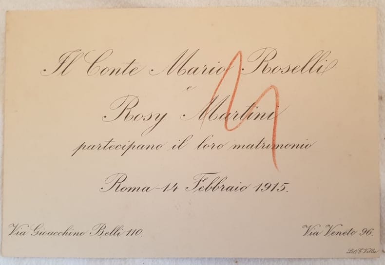 Partecipazione di nozze del Conte Mario Roselli e Rosy Martini a Roma il 14 febbraio 1915<BR>In ottime condizioni. Formato cm 10x15. Beautiful wedding card of Count Mario Roselli and Rosy Martini in Rome the 14th of february 1915 In very good conditions.<BR>Size cm 10x15.