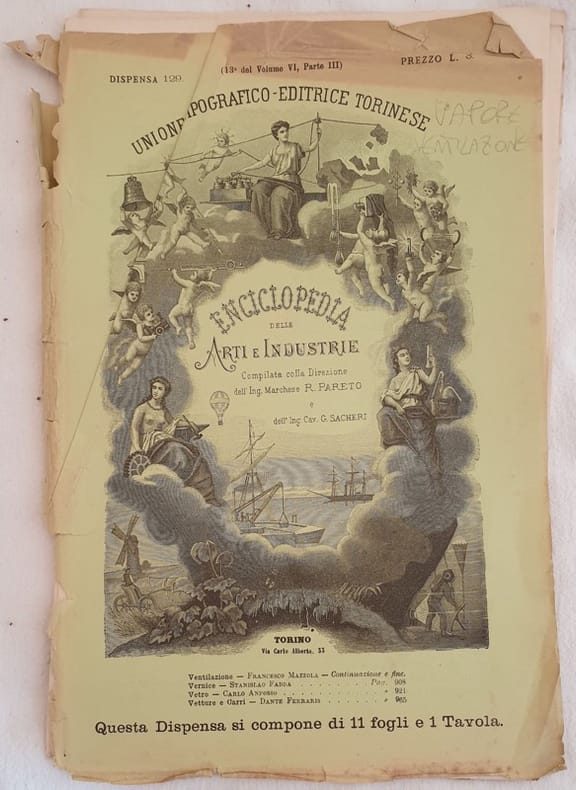 Interessante estratto del 1890 circa tratto dall'Enciclopedia delle arti e industrie edita da Utet sul vapore scritto da Penati e la ventilazione di F. Mazzola. La parte relativa al vapore da pag. 873 e consta di 5 pagine mentre la parte sulla ventilazione inizia da pag. 877 e consta di 32 pagine. All'interno le varie tecniche e i progetti di ventilazione (ventilazione delle gallerie, ventilazione artificiale ecc...) In ottime condizioni. Copertina assente. Legatura assente. All'interno le pagine si presentano in ottime condizioni con rare fioriture. In 4. Dim. 31x20 cm. Pp. da 873 a 908. Interesting extract of 1890 from Enciclopedia delle arti e industrie edited by Utet about steam by Penati and ventilation by Mazzola The part relating steam begins from pag. 873 and is made up of 5 pages, ventilation from page 877 and is made up of 32 pages. Inside different techniques of projects of ventilation (galleries, artificial etc...) In very good conditions. Cover is missing. Binding is missing. Inside pages are in very good conditions with occasional foxings. In 4. Dim. 31x20 cm. Pp. da 873 a 908.