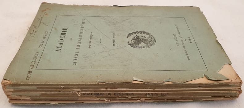 Edizione del 1886 di questo volume edito dall'Academie des sciences belles lettres et arts de Besancon" relativo all'anno 1886. Tra le memorie presenti: discorsi pronunciati agli ossequi del Conte di Vaulchier, Notizia di Bouquet e Gachard, Pingaud, Accademia di Besancon del 1789 a 1814, Clesinger, Cardinale di Bonnechose magistrato a Besancon, Rapporto sui concorsi di poesia, Victor Hugo e Franche Comte, Chiesa priorale di Courtefontaine, Lanerenon, Una fiaba del Conte Amedee Benevton, Marchese di Loray, Inaugurazione della Vallata d'Ornans l'11 maggio 1885, I monumenti dell'Abbazia di Cherlieu ecc Qualche planche allinterno (Carreaux emailles di Roulans, Facciata della Chiesa di Courtefontaine, Piano della Chiesa di Cherlieu, Tomba di Claude de Nicey Abate di Cherlieu). Note manoscritte in copertina. In discrete condizioni. Coperta editoriale in discrete condizioni generali con usure ai margini e dorso. Legatura in mediocri condizioni con rotture. All'interno le pagine si presentano in ottime condizioni con rare fioriture. In 8. Dim. 22,5x15 cm. Pp. XXXII+348. Edition of 1886 of this volume edited by Academie des sciences belles lettres et arts de Besancon" relating year 1890. Between the memories inside: pronounced speeches to the Count Vaulchier, Information of Bouquet and Gachard, Pingaud, Academy of Besancon of 1789 to 1814, Clesinger, Cardinal of Bonnechose in Besancon, Report about concourse of poems, Victor Hugo and Franche Comte, Church of Courtefontaine, Lanerenon, A Tale of the Count Amedee Benevton, Marquise of Loray, Inauguration of Valley of Ornans the 11st of may 1885, The monuments of Abbazia di Cherlieu ecc... Handwritten notes. In fair conditions. Editorial cover in fair general conditions with wearings in the edges and spine. Binding is almost missing. Pages are in very good conditions with occasional foxings. In 8. Dim. 22,5x15 cm. Pp. XXXII+348