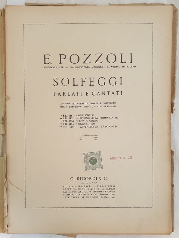 Edizione Ricordi del dicembre 1935 di questo manuale di solfeggio parlato e cantato di Enrico Pozzoli. Siamo in possesso del secondo corso solamente (E.R. 1153). In discrete condizioni Copertina editoriale in mediocri condizioni con leggeri usure ai margini e dorso coperta da carta. Usure e parti mancanti. Legatura con rotture. Pagine in buone condizioni con fioriture. Note manoscritte. Formato cm. 32x23,5. Pp. 78. Ricordi edition of december 1935 of this manual about spoken and chanted solfeggio by Enrico Pozzoli. We only have the seocnd part (E.R. 1153). In fair conditions. Editorial cover in poor conditions slightly worn in the edges and spine covered by paper. Wearing and losses. Binding with cracks. Pages in good conditions with foxings. Handwritten notes. Formato cm. 32x23,5. Pp. 78