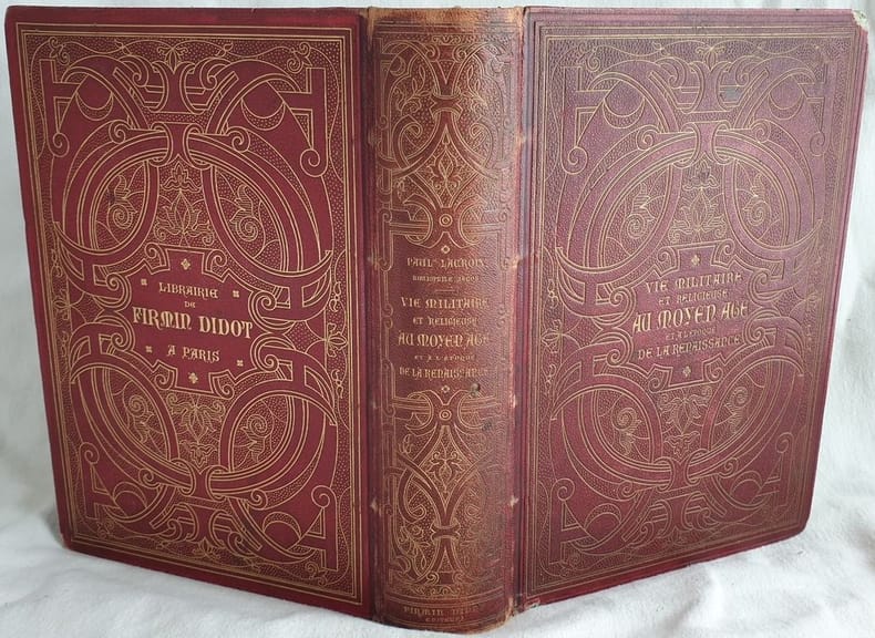 Paris, Firmin-Didot 1873-1877 Série complète de 4 volumes sur le moyen age et la renaissance, I: v,577 pp.illustré de 14 chromolithographies et de 410 gravures sur bois gravées par Huyot père et fils (2e éd.), II: iv,603pp. illustré de 15 chromolithographies et de 440 gravures sur bois (4e éd.), III: 548pp.illustré de 19 chromolithographies et de 400 gravures sur bois (5e éd.), IV: iv,612pp.illustré de 13 chromolithographies et de 400 gravures sur bois, reliures d'éditeur plein-cuir rouge avec décorations dorées, toutes tranches dorées, 29cm., bel état