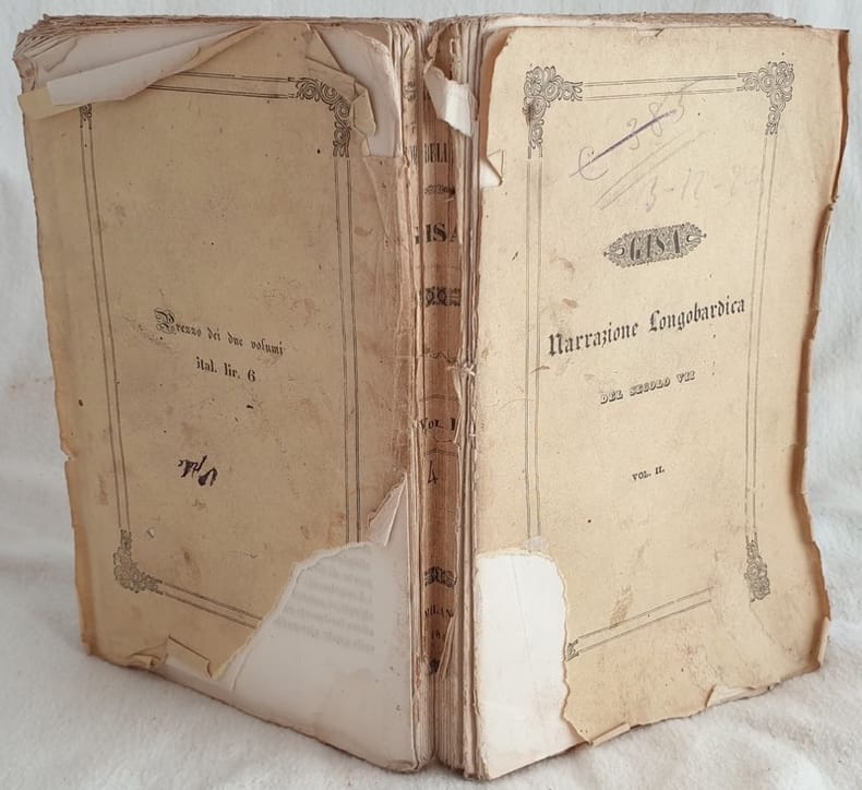 Prima edizione del 1843 di questo romanzo storico scritto da Antonio Corbellini. L'opera era composta da due volumi, siamo purtroppo in possesso solo del secondo tomo. Antiche note manoscritte. In mediocri condizioni. Copertina editoriale in mediocri condizioni generali con usure e parti mancanti ai margini e dorso. Legatura in discrete condizioni con rotture. All'interno le pagine si presentano in ottime condizioni con rare fioriture. In 8. Dim. 19,5x13 cm. Pp. 304First edition of 1843 of this hiostorical novel written by Antonio Corbellini. The work was made up of two volumes, unfortunately we only have the second tome. Ancient handwritten notes. In poor conditions Editorial cover in poor general conditions with wearings and losses in the edges and spine. Binding in fair conditions with cracks. Pages are in very good conditions with occasional foxings. In 8. Dim. 19,5x13 cm. Pp. 304