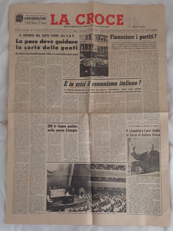 Numero del 10 ottobre 1965 del settimanale politico cattolico "La croce". All'interno: Il discorso del Santo Padre all'ONU, E' in crisi il comunismo italiano?, P. Lisandrini e Prof. Gedda al corso di cultura civica, I socialisti e la CGIL, Interessante mostra al Maschio Angioino, Cardito piange due suoi figli, Monumenti a Don Giustino Russolillo, Sante Quarantore, Card. castaldo, A Lourdes i ferrovieri infermi, La bocca della selva è sul Massiccio del Matese, il Senatore Bosco per i problemi di Baia e Latina ecc... Numerose foto in bianco e nero ed a colori all'interno.<BR>In buone condizioni. Brossura editoriale in buone condizioni generali con lievi usure ai margini e dorso. Legatura in buone condizioni. All'interno le pagine si presentano in buonee condizioni. In folio. Dim. 59x43 cm. Pp. (4). Number of the 10th of october 1956 of the hystorical magazine Epoca published in Milan from 1950 until 1997. Inside: the speech of Holy Father to ONU, The italian comunism is in crisis?, P. Lisandrini and Prof. Gedda of civic culture, Socialists and CGIL, Interesting exibition in Maschio Angioino, Cardito, Monuments to Don Giustino Russolillo, Sante Quarantore, Card. Castaldo, Lourdes illd ferrovists, Massiccio del Matese, Senatore Bosco for the problems of Baia and Latina ecc... Different black and white photoes inside In good conditions. Editorial cover in good general conditions slightly worn in the edges and spine. Front plate is detached. Binding in good conditions. Inside pages are in very good conditions. In folio. Dim. 59x43 cm. Pp. (4).