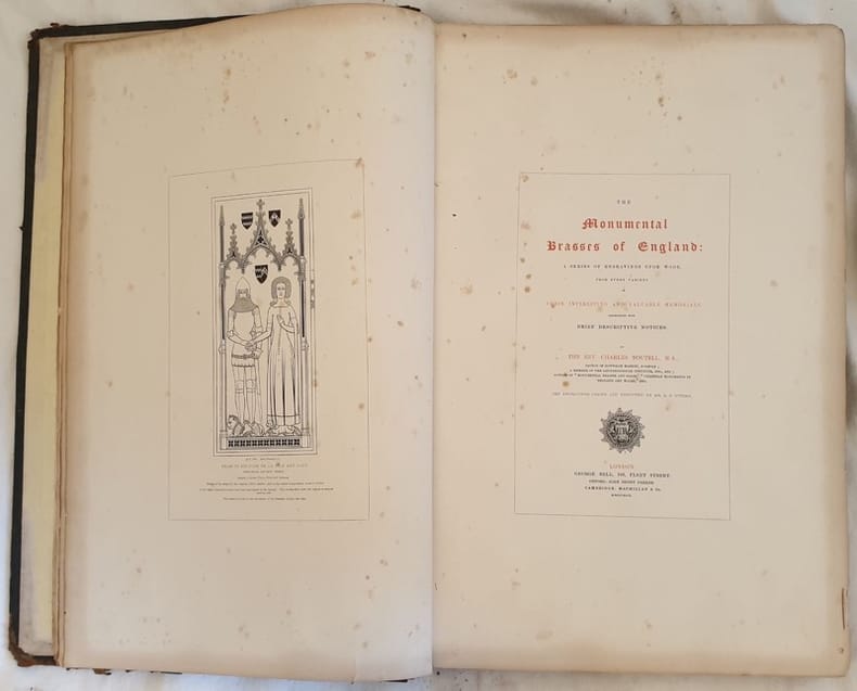 Edizione del 1849 di grandi dimensioni di questa celebre opera dell'archeologo inglese Charles Boutell noto per i suoi libri sulla cavalleria e per i monumenti funebri in rame, tipici delle cattedrali europee e inglesi. Parte descrittiva all'inizio dell'opera alla quale seguono circa 150 incisioni fuori testo che mostrano lastre funebri di Re, Arcivescovi, Cavalieri, Nobili e altre importanti figure del XIV e XV secolo. Lingua inglese. In buone condizioni e completa. Copertina in mezza pelle coeva con titolo e decorazioni in oro al dorso in mediocri condizioni generali con usure ai margini e dorso. Parte di stoffa attaccata al dorso. Legatura in buone condizioni . Pagine in buone condizioni con fioriture. In 4. Dim. 32x25,5 cm. Pp. 225 circa. Peso Kg. 4,300. Monumental edition of 1849 of this famous work by the english archeologist Charles Boutell known for his famous book on English heraldry and monumental brasses. Brasses, which are a form of engraving, were popular forms of memorials used by English and European cathedrals. Description at the beginning at the work then circa 150 out of text plates featuring monumental brasses of Kings, Archibyshops, Knights, Nobles and other important figures of 14th and 15th century. English language. In good conditions and complete. Half leather coeval cover with golden title in the spine and plates in poor general conditions damaged in the extremities. Part of cloth attached in the spine. Binding in good conditions. Pages are in good conditions with foxings. In 4. Dim. 32x25,5 cm. Pp. 225 circa. Weight Kg. 4,300.