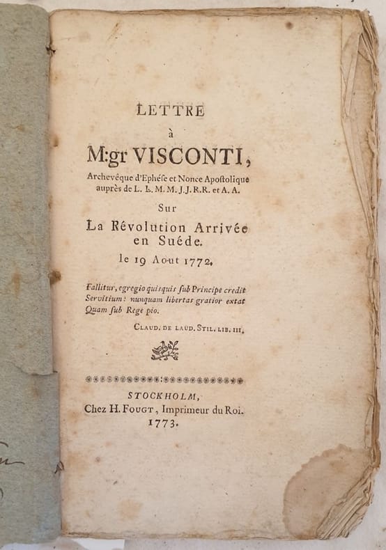 Prima edizione francese del 1733 stampata a Stoccolma di questa rara opera sul colpo di Stato del Re Gustavo III di Svezia nel 1772. Purtroppo riusltano mancanti le pagine 7, 9, 55, 57. Antiche note manoscritte al contropiatto anteriore. In discrete condizioni. Copertina morbida coeva in discrete condizioni generali con usure ai margini e dorso. Piatto posteriore assente. Legatura in mediocri condizioni. All'interno le pagine si presentano in buone condizioni con fioriture. In 8. Dim. 19,5x12,5 cm. Pp. (2)+172. first french edition of 1733 published in Stockholm of this scarce work about the coup d'etats of the King Gustavo III of Sweden in 1772. Unfortunately pages 7, 9, 55, 57 are loss. Antique handwritten notes in the internal counterplate. In fair conditions. Soft coeval cover in fair general conditions with wearings in the edges and spine. Back plate is loss. Binding in poor conditions. Inside pages are in good conditions with foxings. In 8. Dim. 19,5x12,5 cm. Pp. (2)+172.