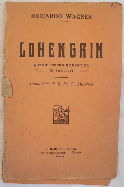 Edizione Barion del 1926 del libretto d'opera dell'opera "Lohengrin" di Richard Wagner (1813-1883) compositore, librettista, direttore d'orchestra tedesco. Traduzione di S. De C. Marchesi. L'opera venne rappresentata per la prima volta a Bologna al Teatro Comunale.<BR>In discrete condizioni. Brossura editoriale in mediocri condizioni generali con usure ai margini e dorso e piatti staccati. Legatura in buone condizioni. All'interno le pagine si presentano in discrete condizioni con fioriture. In 16. Dim. 18,5x12 cm. Pp. 32. Beautiful booklet of 1926 of the work "Lohengrin" written by Richard Wagner (1813-1883) composer, booklet writer, german orchestra director.<BR>The work was represented for the first time in Bologna in the Teatro Comunale.<BR>In good conditions. Editorial cover in poor general conditions with wearings in the edges and spine and plates detached. Binding in good conditions. Inside pages are in fair conditions with foxings. In 16. Dim. 18,5x12 cm. Pp. 32.
