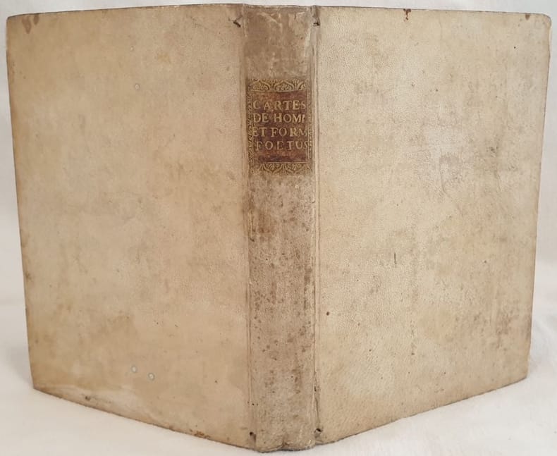Edizione del 1686 di questa importante opera del filosofo francese René Descartes (1596-1650), il primo tentativo di approccio alla fisiologia umana. All'interno dell'opera sono presenti finissime incisioni la gran parte illustrazioni anatomiche, basate in parte sui disegni manoscritti di Cartesio e in parte curat da Louis de La Forge (1632-1666) e Gérard van Gutschoven (fl. 1660). Prefazione a cura di Claude Clerselier (1596-1650) allievo di Cartesio. In ottime condizioni. Coperta in piena pergamena con titolo in oro dorso in ottime condizioni generali con lievi usure ai margini e dorso. Legatura in buone condizioni. Pagine in ottime condizioni con fioriture. Lievi gore d'umidità marginali. Bruniture. Piccola macchia di inchiostro di 1 cm a pagina 171 e 173 con legegra perdita di testo. In 4. 210 x 160 mm [(80)+239+(1)]. Peso Kg. 0,520. Contents: [(80)+239+(1)]. In 4 (8.3 x 6.3 in; 210 x 160 mm) Weight Kg. 0,520. Condition of contents: Very good conditions. Foxings. Light water stains in the extremities. Yellowings. Little inks stain of 1 cm in page 171 and 173 with light loss of text. Condition of binding: Parchment cover with golden title in very good conditions lightly worn in the extremities. Edition of 1686 of this important work by the french phylosopher René Descartes (1596-1650), the first approach of explanation of human physiology. The fine woodcuts, mainly anatomical illustrations, were partly based on Descartes' drawings from the manuscript and partly prepared by Louis de La Forge (1632-1666) and Gérard van Gutschoven (fl. 1660). Prefation by Claude Clerselier (1596-1650) pupil of Descartes.