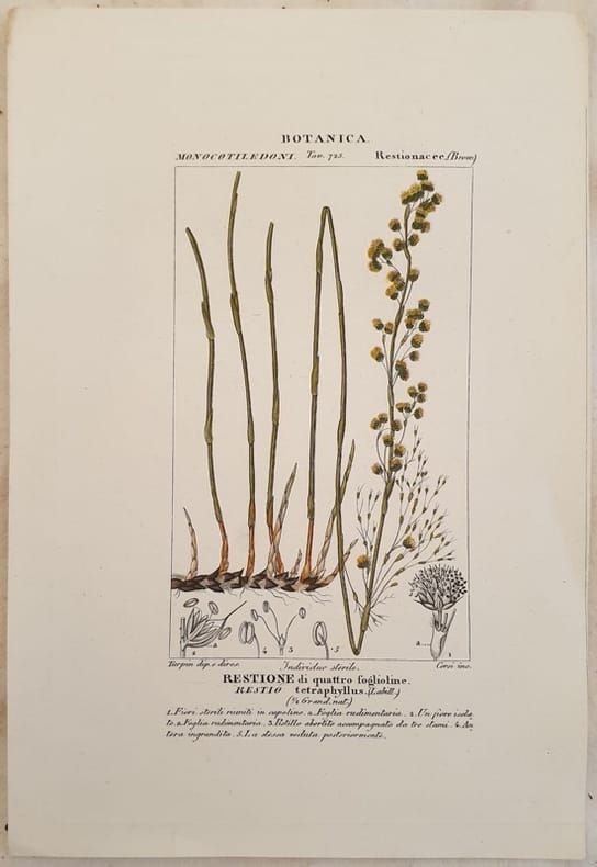 INCISIONE: Litografia con coloritura coeva all'acquarello AUTORE: Corsi su disegno di Turpin ATLANTE: Dizionario di scienze naturali, Firenze Battelli 1831 DIMENSIONI FOGLIO: cm 25,5x17,5 DIMENSIONI INCISIONE: cm 15x9 EPOCA: 1831 circa CONDIZIONI: buone condizioni. Quest'opera imponente era composta da 29 volumi ed era corredata da centinaia di incisioni che rappresentavano tutto il mondo animale e vegetale. L'opera deriva da un eccellente lavoro di luminari del XVIII secolo supportati dal Re francese Louis XV in seguito guidati dallo stesso Turpin, considerato al tempo il più grande incisore di botanica.<BR>La maggior parte delle incisioni sono firmate Turpin & Pretre.<BR>Carta bianchissima e resistente di ottima qualità. ENGRAVING: Lythograph with coeval colouring with acquarello painting AUTHOR: Corsi after Turpin ATLAS: Dizionario di scienze naturali, Firenze Battelli 1831 SIZE OF PAGE: cm 25,5x17,5 SIZE OF THE ENGRAVING: cm 15x9 PERIOD: 1831 circa CONDITIONS: good conditions. This imponent work was made up by 29 volumes and contained hundreds of engravings that represented all the plant and animal kingdom. This work derives from an excellent work of luminaries of the 18th century supported by the french King Louis XV and then directed by the same Turpin that was considered as the greatest botanical engraver of his time. The most of his engravings are signed Turpin & Pretre.<BR>Very white strong paper of good quality.