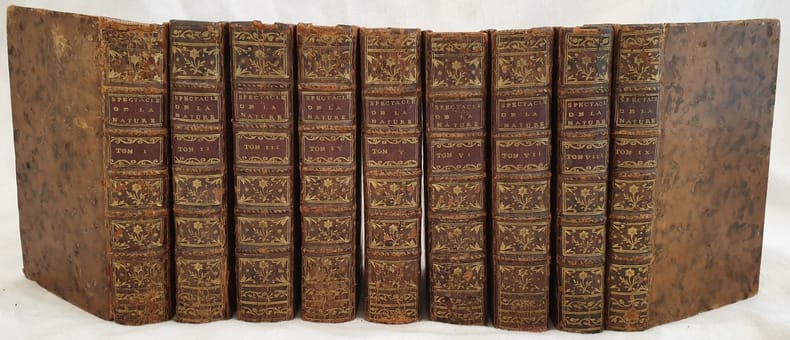 Bella edizione completa del 1771 della celebre opera di Noel Pluche (1688-1761). L'opera è composta da nove volumi ed è completa. Pubblicata per la prima volta nel 1732 venne tradotta in tutta Europa. Sebbene influenzò molti a diventare naturalisti è un'opera di divulgazione popolare non scientifica. Il testo è impreziosito da più di 200 planches fuori testo qualcuna ripiegata. Tra gli argomenti trattati nell'opera: insetti, api, uccelli, piante, fiori, giardinaggio e potatura, aratura, fiumi, montagne, mare, cielo, cosmografia, globi, fisica (zodiaco, luce, visione, scoperta delle stelle polari), Invenzioni moderne (microscopio, bussola, telescopio), uomo sulla terra, Dominio dell'uomo: intelligenza, immaginazione, memoria, liberta, Scienze: logica, fatti e misure, forze, ottica, societa, matrimonio, educazione, taglia degli abiti, mobili, tinture, mobilio, arti dell'uomo, professioni, musica barocca e cantata, Paleografia francese ecc... Tra i soggetti delle planches: insetti tra cui farfalle, conchiglie, uccelli,piante di progettazione di giardini, olivo, mais, ananas, strumenti per l'agricoltura, numerosi modelli di vascelli, pesci, diverse mappe di costellazioni, mappe (Africa, Europa ecc..), sfera armillare, molini, vari mestieri (sbiancamento della cera, fonderia ecc..). Antica firma al frontespizio. In ottime condizioni. Copertina in piena pelle coeva con titolo in oro al dorso in buone condizioni con lievi usure ai margini e dorso. Legatura in ottime condizioni. Pagine in ottime condizioni con rare fioriture. Piccola galleria di tarlo alle prime 316 pagine del tomo IV. In 16. cm. 17,5x11. Pp. (4)+XXII+(2)+561+(3)+(26), (4)+XXIII+(1)+468+(37), (6)+575+(1)+(32), (4)+599+(3)+(28), (6)+596+(4)+(23), (8)+598+(4)+(30), (8)+554+(6)+(33), 436+(2), (4)+388+(4). Peso Kg. 3,800 Beautiful complete edition of 1771 of the famous work by Noel Pluche (1688-1761). the work is amde up of nine volumes and it is complete. Published for the first time in 1732 was translated in many languages. Though it influenced many to become naturalists is a work of popularization not science. the text is enriched by more than 200 out of text planches some folded. The issues in the work: insects, animals, plants, flowers, gardenining and pruning, rivers, mountains, sea, sky, cosmography, globes, physics, (zodiac, light, vision, discovery of polar stars), modern inventions (microscope, telescope), man on earth, science, optic, society, jobs, french paleography ecc... The illustrations in the planches: insects, plants, agriculture, gardening, maps of stars, armillar sphere etc... Antique signature in the title page. In very good conditions Full leather coeval cover with golden title in the spine in good conditions with wearings and losses in the extremities. Binding in very good conditions. Pages in very good conditions with occasional foxings. Little worming in the first 316 pages of tome IV. In 16. cm. 17,5x11. Pp. (4)+XXII+(2)+561+(3)+(26), (4)+XXIII+(1)+468+(37), (6)+575+(1)+(32), (4)+599+(3)+(28), (6)+596+(4)+(23), (8)+598+(4)+(30), (8)+554+(6)+(33), 436+(2), (4)+388+(4). Peso Kg. 3,800