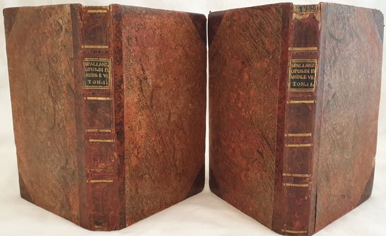 Edizione originale del 1776 di questa importante opera scientifica del biologo italiano Lazzaro Spallanzani (1729-1799), il Padre scientifico della fecondazione artificiale. Spallanzani confutò la teoria della generazione spontanea con un esperimento poi perfezionato da Louis Pasteur. In quest'opera raccoglie alcune teorie sulla fecondazione. Lettere del filosofo naturalista Charles Bonnet (1720-1793). "Il trattato principale nel secondo volume degli Opuscoli confermò ed estese le osservazioni di Leeuwenhoek sugli spermatozoi (iniziato nel 1677) e confutò i concetti sbagliati di Buffon sulla natura e origine della natura... Gli altri tre opuscoli sono di minore importanza. Il primo riguarda osservazioni ed esperienze intorno agli animali e vegetali chiusi nell'aria, il secondo su alcuni prodigiosi animali che in balia dell'osservatore il farli tornare da morte a vita',...e il terzo sulle muffe]" (DSB). Prandi, Bibliografia, pp. 36-37. Sei planches ripiegate con diverse illustrazioni degli esperimenti incise da Cagnoni. In ottime condizioni. Copertina in mezza pelle coeva con titlo su tassello al dorso in ottime condizioni con lievi usure ai margini e dorso. Legatura in buone condizioni. Pagine in buone condizioni con fioriture e bruniture. In 8 In 4. 215 x 150 mm. Pp. Pp. [XVI+304+(2)+VI, (4)+277+(1)] Contents: [XVI+304+(2)+VI, (4)+277+(1)]. In 4 (8.46 x 5.9 in; 215 x 150 mm) 2 vols. Weight Kg. 0,835. Six folded plates with different illustrations of his experiments engraved by Cagnoni. Condition of contents: Very good conditions. Foxings. Yellowings. Condition of binding: Half leather coeval cover with golden title in very good conditions lightly damaged in the extremities. First edition of 1776 of this important scientiphic work by the italian biologist Lazzaro Spallanzani (1729-1799), the scientiphic Father of artificial fecondation. Spallanzani refuted the theory of spontaneous fecondation with an experiment then perfetioned by Louis Pasteur. He collected some of his theories about fecondation in this work. Letters by naturalist phylosopher Charles Bonnet (1720-1793). The main treatise in the second volume of the Opuscoli confirmed and extended Leeuwenhoek's observations on spermatozoa (which began in 1677) and refuted Buffon's erroneous concepts of their nature and origin... The remaining three tracts were of lesser significance. The first concerned the effects of stagnant air upon animals and vegetables,...[the second] concerned animalcules that 'enjoy the advantages of real resurrection after death',...[and the third was on mold]" (DSB, from a long account of this book). Prandi, Bibliografia, pp. 36-37. Graesse,VI, p. 457 - Razzolini-Bacchi della Lega, p. 322 - Pritzel,8811 - Garrison-Morton,239: "Later confutation of the theory of spontaneous generation. Spallanzani's conclusions were similar to those expressed by Pasteur nearly a century later".