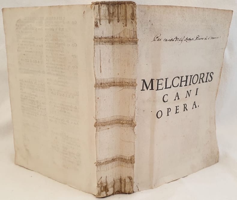 Edizione del 1714 di questa raccolta di opere del Vescovo delle Canarie Melchior Canus dell'Ordine dei predicatori. Il volume contiene due opere: De auctoritate sacrae Scripturae, De Traditionibus apostolicis, De auctoritate conciliorum, De ecclesiae Romanae auctoritate, De Sanctorum auctoritate, De Auctoritate Doctorum Scholasticorum, De argumentis rationis naturalis, De philosophorum auctoritate. Edition of 1714 of this collection of works by the bishop of Canaria Melchior Canus belonging to Preechers Order.<BR>The volume contains the following works: De auctoritate sacrae Scripturae, De Traditionibus apostolicis, De auctoritate conciliorum, De ecclesiae Romanae auctoritate, De Sanctorum auctoritate, De Auctoritate Doctorum Scholasticorum, De argumentis rationis naturalis, De philosophorum auctoritate<BR>The first one is about Holy Writings (authorities, apostolical traditions, Church, Saints, Phylosophers, Human history, Sacraments). The second work is about Sacraments.<BR>Collationed and complete but boundless. Antique signature. Cover is loss. Binding in good conditions. Inside pages are in very good conditions with occasional foxings and wormings sometimes with severe loss of text. Losses in the title page. In 8. Dim. 24x18 cm. Pp. (46)+596+(28).<BR>La prima opera è sulle Sacre Scritture (autorità, tradizioni apostoliche, Chiesa, Santi, Filosofi, Storia umana, Sacramenti).<BR>La seconda opera sui Sacramenti.<BR><BR>Antica firma di possesso.<BR>Collazionata e completa ma priva di legatura.<BR>Copertina asente. Legatura in buone condizioni. All'interno le pagine si presentano in ottime condizioni con rare fioriture. Parte mancante al frontespizio. In 8. Dim. 24x18 cm. Pp. (46)+596+(28).