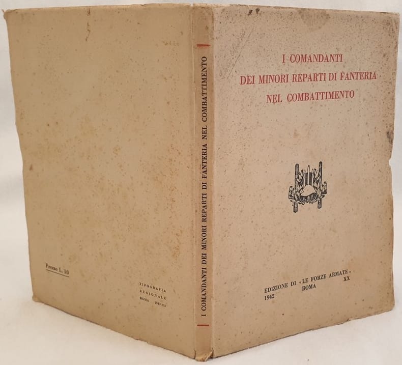 Edizione del 1942 di questo volume sui comandanti dei minori reparti di fanteria nel combattimento. Tra gli argomenti trattati: Che cosa devono saper fare in combattimento i comandanti dei minori reparti di fanteria (fucilieri, comandante di plotone, comandante di plotone mortai da 45, da 81, cannoni di accompagnamento e controcarri, mitragliera da 20), Che cosa deve saper fare in combattimento il comandante di squadra, Esercitazioni, Norme pratiche per l'organizzazione dell'addestramento tattico. All'interno schizzi e mappe militari. In buone condizioni. Copertina cartonata editoriale in buone condizioni generali con lievi usure ai margini e dorso. Legatura in buone condizioni. All'interno le pagine si presentano in ottime condizioni con fioriture. In 8. Dim. 19x14 cm. Pp. 183+(1) Edition of 1942 of this volume about commanders of minor infantry in fighting. Inside sketches and military maps In good conditions. Carton editorial cover in good general conditions lighlty worn in the extremities. Binding in good conditions. Inside pages are in very good conditions with foxings. In 8. Dim. 19x14 cm. Pp. 183+(1)