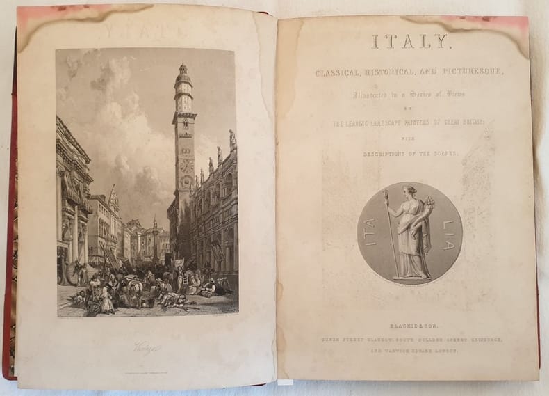Prima edizione del 1843 circa di questa finissima opera di vedute italiane di Camillo Mapei (1809-1853) sacerdote e teologo italiano. Mapei fu tra le figure di spicco del protestantesimo italiano del periodo risorgimentale, nonché patriota ed esule politico. Le vedute sono tratte dai disegni di vari artisti, tra cui Brockedon, Stanfield, Roberts, Harding, Prout, Leitch e Barnard. Ogni veduta accompagnata dalla descrizione delle scene e da un saggio introduttivo sullo stato politico, religioso e morale dell'Italia di metà Ottocento. Le città presenti: Vicenza, Nizza, Ventimiglia, Genova, Lerici, Carrara, Pisa, Firenze, Certaldo, Siena, Arezzo, Cortona, Perugia, Chiusi, Radicofani, Bolsena, Viterbo, Orvieto, Narni, Cascata delle MArmore a Terni, Civita Castellana, Civita VEcchia, Roma, Pratica, Castel Gandolfo, Olevano, Terracina, Napoli, Castellammare di Stabia, Sorrento, Meta, Amalfi, Paestum, REggio, Benevento, Isola di Sora, Subiaco, Assisi, Loreto, Ancona, Bologna, Ferrara, Padova, Venezia, Bassano, Brescia, Rocca d'Anfo, Bergamo, Louvere, Como, Varese, Milano, Pavia, Val Lucerna, Forte Bard. Testo inglese. In buone condizioni e completo. Copertina in mezza pelle con titolo in oro al dorso in buone condizioni generali con lievi usure ai margini. Legatura in buone condizioni. Pagine in buone condizioni con rare fioriture. Lieve gora d'umidità al margine superiore di quasi tutto il volume. La veduta di Louvere è stata legata male ma è presente. In 4. Dim. 34x26x5 cm. Pp. II+2+CVIII+160+(61). Peso Kg. 2,9First edition of 1850 circa of this very fine work of italian views by Camillo Mapei (1809-1853) italian priest and theologian. Mapei was one of the most important carachter of italian protestantism of Risorgimento period, patriot and political exilated. The views are after drawings of different artists as Brockedon, Stanfield, Roberts, Harding, Prout, Leitch e Barnard. For each view description and introductive essay about political, religious and mopral condition of that period. The city in the views: Vicenza, Nizza, Ventimiglia, Genova, Lerici, Carrara, Pisa, Firenze, Certaldo, Siena, Arezzo, Cortona, Perugia, Chiusi, Radicofani, Bolsena, Viterbo, Orvieto, Narni, Cascata delle MArmore a Terni, Civita Castellana, Civita VEcchia, Roma, Pratica, Castel Gandolfo, Olevano, Terracina, Napoli, Castellammare di Stabia, Sorrento, Meta, Amalfi, Paestum, REggio, Benevento, Isola di Sora, Subiaco, Assisi, Loreto, Ancona, Bologna, Ferrara, Padova, Venezia, Bassano, Brescia, Rocca d'Anfo, Bergamo, Louvere, Como, Varese, Milano, Pavia, Val Lucerna, Forte Bard.<BR>In good conditions and complete. Half leather coeval cover with golden title in the spine in good general conditions lightly worn in the edges and spine. Binding in good conditions. Pages are in good conditions with occasional foxings. Light water swtain in the upper edge of almost the whole volume. The view of Louvere has been bound in a wrong position. In 4. Dim. 34x26x5 cm. Pp. II+2+CVIII+160+(61). Peso Kg. 2,9