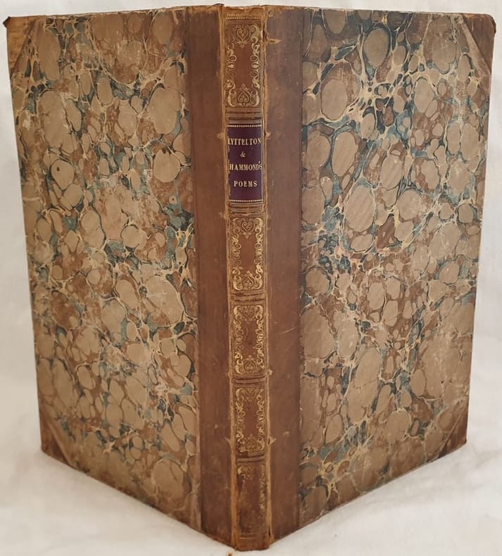 Finissima edizione del 1787 di questa raccolta di opere poetiche del nobile e politico inglese George Lord Lyttelton (1709-1773). Antica firma al frontespizio. Legato insieme in fine le opere poetiche di James Hammond (1710-1742) L'opera è in un volume ed è completa In ottime condizioni. Copertina in mezza pelle con ricche decorazioni in oro al dorso in buone condizioni con lievi usure ai margini e dorso. Rottura al dorso. Legatura in ottime condizioni. All'interno le pagine si presentano in ottime condizioni con rare fioriture In folio. Dim. 38x25 cm. Pp. XV+(1)+IV+130+(4)+VIII+III+(3)+45+(3). Peso Kg. 1,581Very fine edition of 1787 of this colelction of poetical works by the english politican and nobleman George Lord Lyttelton (1709-1773). Ancient signature in the title page. In the end of the volume the poetical works of James Hammond (1710-1742) The work is in one volume and it is complete <BR>In very good conditions. Half leather cover with rich golden decorations in the spine in good general conditions lightly worn in the edges and spine. Crack in the spine. Binding in very good conditions. Inside pages are in very good conditions with occasional foxings. In folio. Dim. 38x25 cm. Pp. XV+(1)+IV+130+(4)+VIII+III+(3)+45+(3). Peso Kg. 1,581