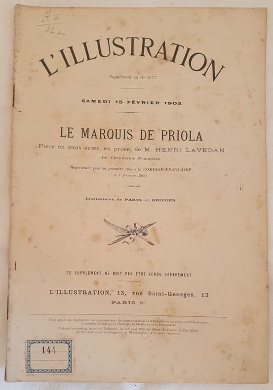 Edizione del 1904 della commedia teatrale Le Marquis de Priola di Henri Lavedan (1859-1940). Le Marquis de Priola è stata rappresentata per la prima volta il 7 febbraio 1902. Numerose illustrazioni di Parys e Krieger. In buone condizioni. Copertina assente. Legatura in buone condizioni. Pagine in buone condizioni con fioriture. In 4. Dim. 30x20,5 cm. Pp. 30. Edition of 1904 of the theatral play Le Marquis de Priola by Henri Lavedan (1859-1940). Le Marquis de Priola has been rappresented for the first time the 7th of february 1902. Diffferent illustrations byParys and Krieger. In good conditions. Cover lacks. Binding in good conditions. Pages in good conditions with foxings. In 4. Dim. 30x20,5 cm. Pp. 30.