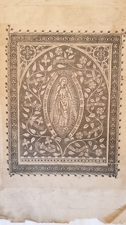 Bella incisione su legno della fine del XIX secolo, Maria concepita senza peccato. L'incisione è applicata su carta. Al verso alcuni fregi architettonici Dimensioni foglio: mm 305x205. Dimensione incisione al margine: mm 200x160. In ottime condizioni. Qualche lieve fioritura. Wonderful original woodcut print of late 19th century Maria concepita senza peccato. The engraving is applied on paper. In the verso some architectonical decorations Size of the page: mm 305x205. Size in the print: mm 200x160. In very good conditions.