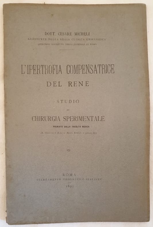 Interessante pubblicazione di nefrologia del 1893 del Dott. Cesare Micheli, chirurgo a Roma. La pubblicazione parla dell'ipertrofia compensatrice del rene, uno studio di chirurgia sperimentale. In buone condizioni. Brossura editoriale in buone condizioni generali con lievi usure ai margini e dorso. Rare fioriture.In 8. Dim. 24x15,5 cm. Pp. 55.Interesting pamphlet of nephrology of 1893 of the Doct. Cesare Micheli, surgeon in Rome. The pamphlet talks about the ipertrophy of the kidney, a study of experimental surgery. In good conditions. Editorial cover in good general conditions slightly worn in the edges and spine. Occasional foxings. In 8. Dim. 24x15,5 cm. Pp. 55.