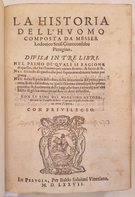 Edizione del 1577 variante B (manca il colophon) di questa opera di Ludovico Sensi giurista letterato e poeta perugino del XVI secolo. Lo scritto è un ampio trattato filosofico di psicologia umana basato sui principi della morale e fede cattolica. Bella incisione a piena pagina raffigurante la Pentecoste a inizio testo. Alla fine del volume alcune rime dell'autore. Finissimi capilettera decorati. In buone condizioni. Copertina in piena pergamena moderna in ottime condizioni generali. Legatura in buone condizioni. Pagine in buone condizioni con rare fioriture. In 8. Dim. 22x16,5 cm. Pp. (8)+272+(28). Edition of 1577 variant B (colophon lacks) of this work by Ludovico Sensi literary jurist abd poet from Perugia of XVI century. The writing is a wide phylosophical treaty of human psychology about the principles of catholic moral and faith. Beautiful full-page engraving representing Pentecost at the beginning of the text. At the end of the volume some ehymes of the author. Very fine decorated initial letters. In good conditions. Modern parchment cover in very good general conditions lightly worn in the extremities. Binding in good conditions. Pages are in good conditions with occasional foxings. In 8. Dim. 22x16,5 cm. Pp. (8)+272+(28).