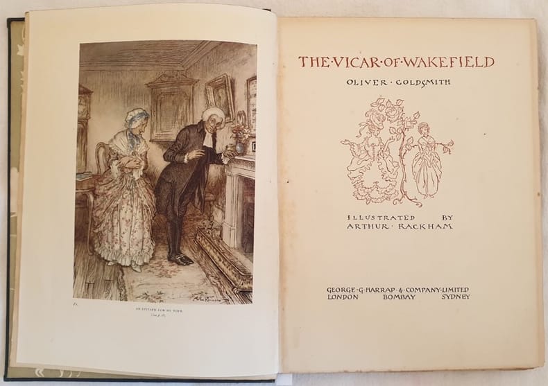 Prima edizione del 1929 del celebre romanzo settecentesco di Oliver Goldsmith.<BR><BR>All'interno sono presenti numerose planches colorate e disegni in bianco e nero di Arthur Rackham (1867-1939) acquarellista pittore illustratore celebre per aver illustrato romanzi famosi come Alice's adventures inw onderland, Rip Van Winckle ecc...<BR><BR>Sovraccoperta mancante. <BR><BR>In ottime condizioni.<BR>Copertina in tela editoriale in ottime condizioni generali con lievi usure ai margini e dorso. Sovraccoperta mancante. Legatura in buone condizioni. Pagine in ottime condizioni con rare fioriture. In 8. Dim. 26x19,5 cm. Pp. 231+(1). First edition of 1929 of the famous novel by Oliver Goldsmith.<BR><BR>Inside there are different coloured plates and black and white drawings by Arthur Rackham (1867-1939) painter illustrator famosu because he illustrated famous novels as Alice's adventures in wonderland, Rip Van Winckle ecc...<BR><BR>Dustjacket is loss. <BR><BR>In very good conditions.<BR>Cloth editorial cover in very good general conditions slightly worn in the edges and spine. Dustjacket is loss. Binding in good conditions. Inside pages are in very good conditions with occasional foxings. In 8. Dim. 26x19,5 cm. Pp. 231+(1).