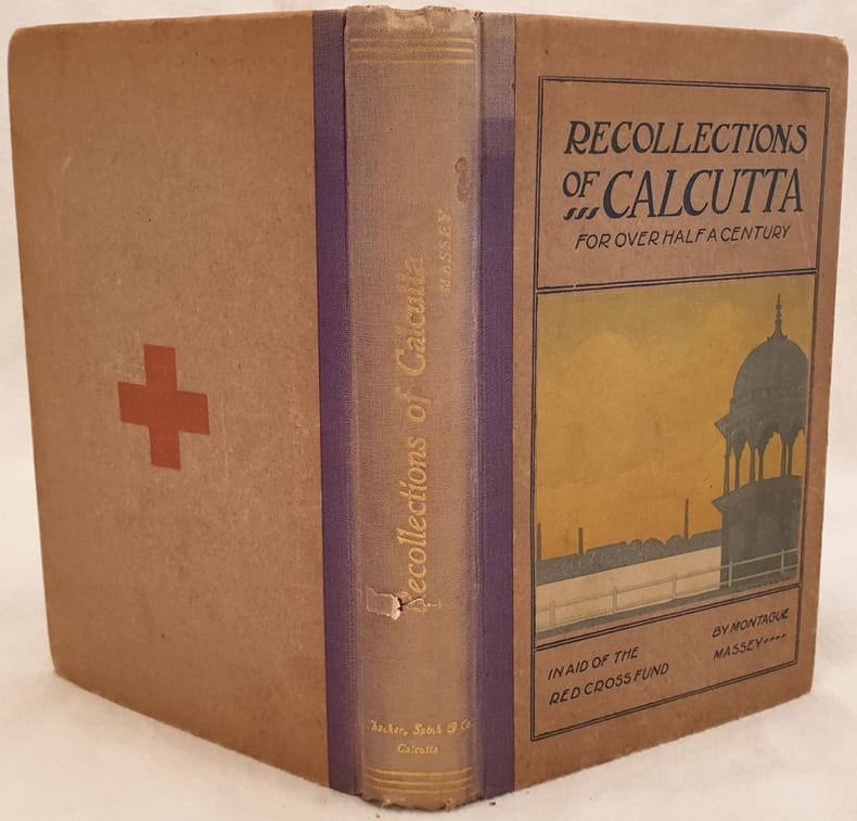 Rarissimo volume del 1918 sulla città di Calcutta pubblicato a beneficio della Croce Rossa di Montague Massey. L'autore descrive la città di Calcutta durante uno dei suoi viaggi per poi proseguire dal punto di vista topografico e i miglioramenti strutturali. All'interno sono presenti 105 planches fotografiche che mostrano zone di calcutta: Government House, Belvedere, MEdical College Hospital, Eden Gardens, St Pauyl Cathedral, Nimtollah, Burra Bazaar, Chipore Road, Govindpur, Colvin Ghat, Howrah Bridge, Bank of BengalRanken & Co, House Street, Belatee Bungalow, Dalhousie Square, The Old ROyal Exchange, Prinsep's Ghat, Hamilton & co., Mc Leod's & co., Alliance bank di Simla, Esplanade, Sir Stuart Hogg Market, W. Leslie & Co., Walter Locke, Park House, Chowringhee ecc... In buone condizioni. Copertina in mezza tela con titolo e decorazioni in oro al dorso e brossura editoriale applicata in buone condizioni generali con lievi usure ai margini e dorso. Legatura in buone condizioni. All'interno le pagine si presentano in buone condizioni con fioriture. In 8. cm 22x15. Pp. XVII+114 Very scarce volume of 1918 about the city of Calcutta published to the benefit of REd Cross by Montague Massey. The author describes the city of Calcutta during one of his travels, tppography, street and general structural improvements. Inside there are 105 photographic plates featuring areas of Calcutta: Government House, Belvedere, MEdical College Hospital, Eden Gardens, St Pauyl Cathedral, Nimtollah, Burra Bazaar, Chipore Road, Govindpur, Colvin Ghat, Howrah Bridge, Bank of BengalRanken & Co, House Street, Belatee Bungalow, Dalhousie Square, The Old ROyal Exchange, Prinsep's Ghat, Hamilton & co., Mc Leod's & co., Alliance bank di Simla, Esplanade, Sir Stuart Hogg Market, W. Leslie & Co., Walter Locke, Park House, Chowringhee ecc... In good conditions. Half cloth cover with gilted title in the spine and editorial cover applied in good conditions lightly worn in the extremities. Binding in good condition. Pages in good conditions with foxing. In 8. cm 22x15. Pp. XVII+114<BR><BR>