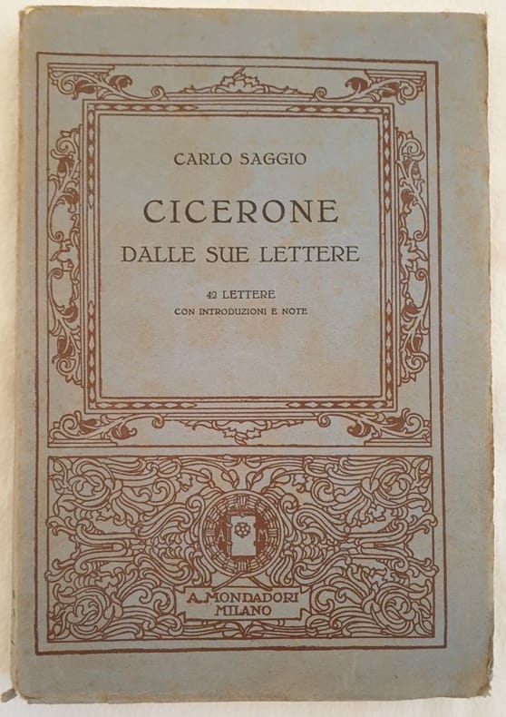 Edizione Mondadori del 1934 di una selezione di 42 lettere di Marco Tullio Cicerone. Testo latino con introduzione e note di Carlo Saggio. Planche con ritratto di Cicerone. In buone condizioni. Copertina editoriale in buone condizioni generali con lievi usure ai margini e dorso. Legatura in buone condizioni. Pagine in buone condizioni con rare fioriture. In 8. Dim. 20,5x14 cm. Pp. 203+(3). Mondadori edition of 1934 of aselection of 42 letters by Marco Tullio Cicerone. Latin text with introduction and notes by Carlo Saggio. Plate with portrait of Cicerone. In good conditions Editorial cover in good conditions lightly worn in the extremities. Binding in good conditions. Pages in good conditions with occasional foxing. In 8. Dim. 20,5x14 cm. Pp. 203+(3).