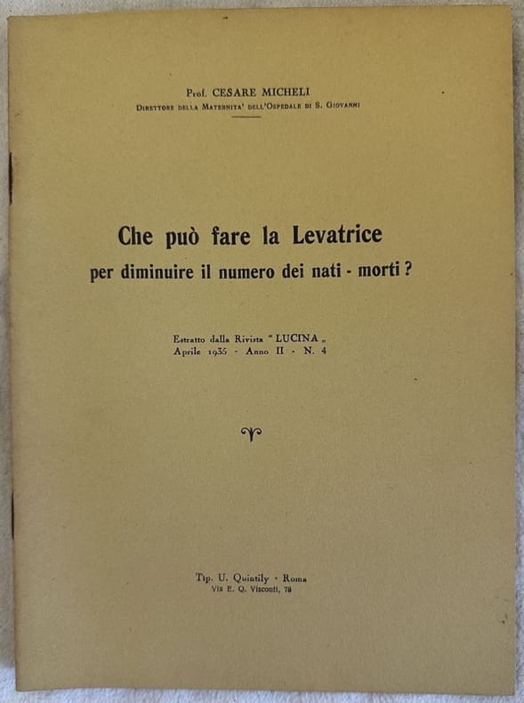 Pubblicazione degli anni '30 di ostetricia del Prof. Cesare Micheli sul ruolo della levatrice per diminuire il numero dei nati morti. Estratto dalla Rivista "Lucina" Aprile 1935 anno II n. 4. In ottime condizioni. Copertina editoriale in ottime condizioni generali con lievi usure ai margini e dorso. Legatura in buone condizioni. All'interno le pagine si presentano in ottime condizioni con rare fioriture. In 8. cm 21x15,5. Pp. 24. Edition of 1930's of obstetrics by Prof. Cesare Micheli about the role of obstetric in decreasing of dead or alive babies. Extract from Magazine "Lucina" April 1935 year II n. 4. In very good conditions. Editorial cover in very good conditions lightly worn in the extremities. Binding in good condition. Pages in very good conditions with occasional foxing. In 8. cm 21x15,5. Pp. 24.<BR><BR>