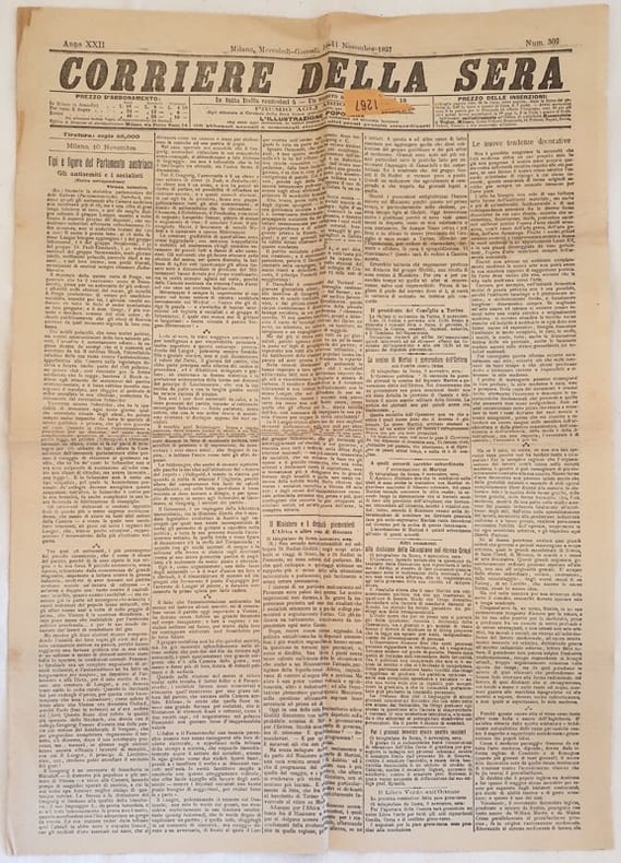 Numero del 10 11 novembre 1897 di questo storico quotidiano italiano fondato a Milano nel 1876. Tra gli articoli presenti: Antisemiti e socialisti nel parlamento austriaco, La nomina di MArini a governatore dell'Eritrea, L'Africa e altre cause di dissenso, Altri commenti alla decisione della Cassazione sul ricorso Crispi, Il processo Campi Altobelli, Il processo Pierantoni uccisore della Contessa Lara, Milano monumento a Giuseppe Parini, Il 50 anniversario delle cinque giornate del 1848 ecc.. Belle pubblicità. Etichette. In buone condizioni.Raro. Brossura editoriale in buone condizioni generali con lievi usure ai margini e dorso. Piegature. All'interno le pagine si presentano in buone condizioni con rare fioriture. Piegature ed usure marginali. In folio. Dim. 59,5x44 cm. Pp. 4.Number of the 10th 11st of november 1897 of this historical daily magazine established in Milan in 1876. Between the issues treated: Anti jewish and socialists in Austrian Parliament, Nomination of MArini as Governor of Eritrea, Africa, Other comments to the decision of Cassazione about trial Crispi, The trial Campi Altobelli, The trial Pierantoni murderer of Contessa Lara, Milan monument to Giuseppe Parini, the 50 anniversary of five days of 1848 etc.. In good conditions. Scarce copy. Editorial cover in good general conditions slightly worn in the edges and spine. Foldings and wearings. Inside pages are in good conditions with foxings. Foldings. In folio. Dim. 59,5x44 cm. Pp. 4.