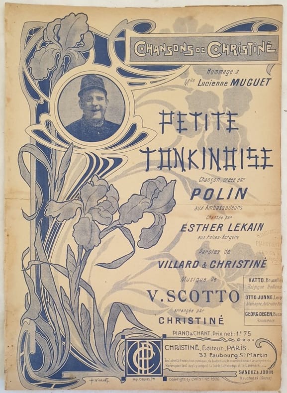 Spartito musicale per pianoforte e canto del 1906 della melodia "Petite Tonkinoise" di Polin. Canto di Esther Lekain e parole di Villard & Christine. Musica di V. Scotto arrangiata da Christine. Copertina illustrata da H. Viollet. In buone condizioni. Copertina in buone condizioni. Legatura in discrete condizioni. Pagine in buone condizioni con rare fioriture. In 4. Dim. 33,5x24,5 cm. Pp. (2). Musical score for piano and chant of 1906 of the melody "Petite Tonkinoise" by Polin. Chant by Esther Lekain and words by Villard & Christine. Music by V. Scotto arrangiata daarranged by Christine. Cover illustrated by H. Viollet. In good conditions Cover in good conditions. Binding in fair conditions. Pages in good conditions with occasional foxings. In 4. Dim. 33,5x24,5 cm. Pp. (2).