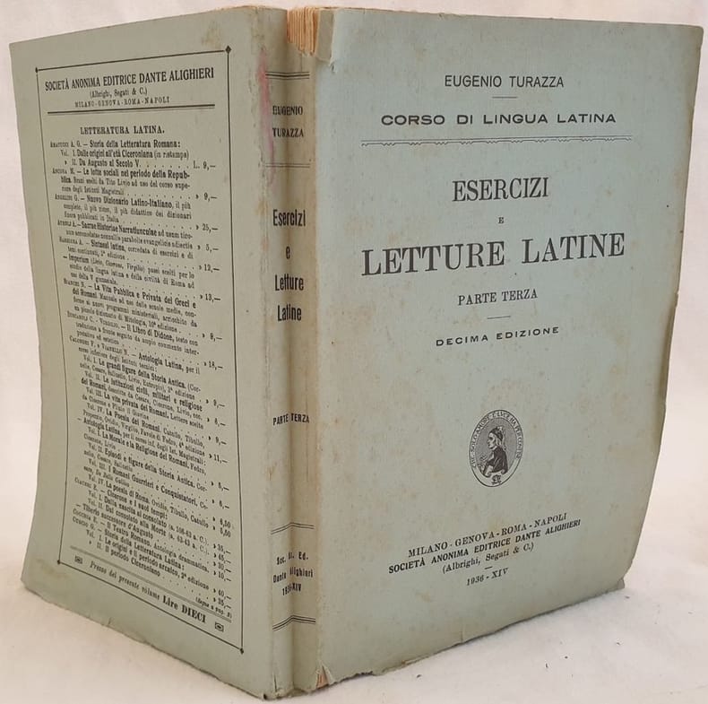 Edizione del 1936 di questa raccolta di esercizi di letture latine di Eugenio Turazza. Siamo in possesso della parte terza solamente. All'interno: Sintassi di concordanza, uso del nominativo, Accusativo, ablativo, compelmenti di luogo tempo e estensione, uso del dativo, genitivo, pronomi, Osservazioni stilistiche sull'uso dei sostantivi e degli aggettivi, Nozioni ed esercizi di prosodia e metrica, Brani italiani per versione, Letture latine ecc... In buone condizioni. Copertina editoriale in buone condizioni generali con lievi usure ai margini e dorso. Legatura in buone condizioni. Pagine in buone condizioni con rare fioriture. In 8. Dim. 21x14,5 cm. Pp. XII+328.Edition of 1936 of this colection of exercises of latin readings by Eugenio Turazza. We only have the third part only. In good conditions. Editorial cover in good conditions lightly worn in the extremities. Binding in good conditions. Pages in good conditions with occasional foxing. In 8. Dim. 21x14,5 cm. Pp. XII+328.