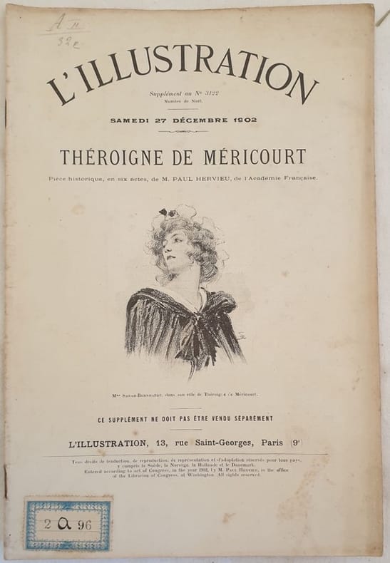 Edizione del 1902 della commedia teatrale Theroigne de Mericourt di Paul Hervieu (1857-1915). Theroigne de Mericourt è stata rappresentata per la prima volta il 23 dicembre 1902 al Teatro Sarah Bernhardt. Numerose illustrazioni di Georges Scott. In buone condizioni Copertina assente. Legatura in buone condizioni. All'interno le pagine si presentano in ottime condizioni con rare fioriture. In 4. Dim. 30x20,5 cm. Pp. 31. Edition of 1902 of the theatral play Theroigne de Mericourt by Paul Hervieu (1857-1915).<BR><BR>Varennes has been rappresented fort he first time the 23rd of december 1902 in the theatre Sarah Bernhardt. Diffeent illustrations by Georges Scott. In good conditions.Cover is missing. Binding in good conditions. Pages in very good conditions with occasional foxings. In 4. Dim. 30x20,5 cm. Pp. 31.