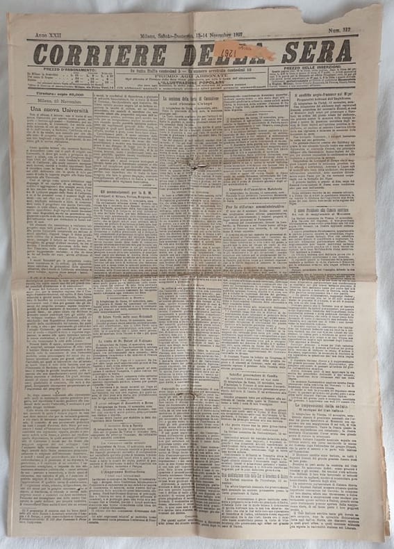 Numero del 13 14 novembre 1897 di questo storico quotidiano italiano fondato a Milano nel 1876. Tra gli articoli presenti: Nuova università a Berkeley California, Accomodamenti per la R. M. coi setajuoli di Milano Torino Bergamo, Conflitto anglo francese sul Niger, Visita di De Bulow al Vaticano, Schoffer governatore di Candia, Castelnuovo Garfagnana, Processo campi Altobelli, Servizio postale a Milano, Riunione autunnale al Trotter italiano ecc.. Belle pubblicità. Etichette. In buone condizioni.Raro. Brossura editoriale in buone condizioni generali con lievi usure ai margini e dorso. Piegature. All'interno le pagine si presentano in buone condizioni con rare fioriture. Piegature ed usure marginali. Buco con testo mancante. In folio. Dim. 59,5x44 cm. Pp. 4. Number of the 13rd 14th of november 1897 of this historical daily magazine established in Milan in 1876. Between the issues treated: New University in Berkeley California,Agreement of R. M. with silk producers of Milan Turin Bergamo, English french conflict on Niger, Visit of De Bulow at Vatican, Schoffer governor of Candia, Castelnuovo Garfagnana, Postal service in Milan, Autumn reunion in Trotter italiano The trial Campi Altobelli etc.. In good conditions. Scarce copy. Editorial cover in good general conditions slightly worn in the edges and spine. Foldings and wearings. Inside pages are in good conditions with foxings. Foldings. In folio. Dim. 59,5x44 cm. Pp. 4.