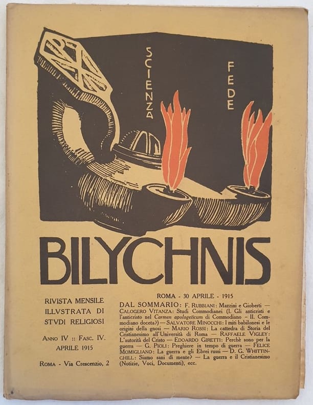 Numero del aprile 1915 della rivista mensile di studi religiosi "Bilychnis" pubblicata tra il 1912 e il 1930. All'interno: Mazzini e Gioberti, Studi commodianei (Gli anticristi e l'anticristo nel Carmen apologeticum di Commodiano), I miti babilonesi e le origine della gnosi, La cattedra di storia del Cristianesimo all'Universita di Roma, Preghiere in tempo di guerra, La guerra e gli ebrei russi, Siamo sani di mente? La guerra e il cristianesimo ecc... Qualche planche all'interno. In discrete condizioni. Copertina editoriale in buone condizioni generali con lievi usure ai margini e dorso. Legatura in discrete condizioni con rotture. Pagine in discrete condizioni con fioriture. In 8. Dim. 25,5x19,5 cm. Pp. da 261 a 336. Number of april 1915 of the monthly magazine of religious studies "Bilychnis" published between 1912 and 1930. Inside: Mazzini and Gioberti, Studi commodianei (Antichrist and the antichrist of Carmen apologeticum of Commodiano), Babylonia and origin of gnosi, History of Christianism in the University, Prayer during war time, War time, War and Christianism etc.... Some plates inside. In fair conditions. Editorial cover in good general conditions lightly worn in the extremities. Binding in fair conditions with cracks. Pages are in fair conditions with foxings. In 8. Dim. 25,5x19,5 cm. Pp. from 261 to 336.