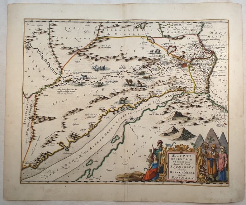 TiTOLO: Aegypti recentior descriptio tratto dal Nieuwen Atlas Amstelodami, Sumptibus Joannis Janssonii 1650 circa Dimensioni del foglio: 487 x 592 mm. Dimensioni dell'incisione: 452 x 506 mm. Tecnica: incisione su rame Condizioni generali: Eccellenti rare fioriture. Piccoli strappi marginali<BR><BR>Meravigliosa mappa dell'Egitto di grandi dimensioni acquarellata a mano tratta dall'Atlante "Nieuwen Atlas" [translation: The New Atlas], di Jan Jansson, pubblicata ad Amsterdam nel 1650 circa. La mappa mostra il Cairo e il fiume Nilo cosi come sfocia al Mar Mediterraneo. Orientata a 90 gradi a sinistra cosi che l'Egitto è in orizzontale. Bellissima raffigurazione delle Piramidi. Descrizione completa dell'Egitto in lingua latina al verso. Jan Jansson, celebre cartografo, appartenente ad una lunga stirpe di stampatori attivi a partire dal XVII secolo. Si stabilirono prima ad Arnhem poi ad Amsterdam. Furono stampatori di mappe, di libri e librai. Title: Aegypti recentior descriptio from Nieuwen Atlas Amstelodami, Sumptibus Joannis Janssonii 1650 circa Sheet size: 19.7 x 23.3 in; 487 x 592 mm. Plate area: 17.8 x 19.9 in; 452 x 506 mm. Overall condition: Excellent condition, with light foxing. Very little tears in the edges. A wonderful large scale hand-colored map of Egypt, from one of the great early 17th-century Atlas "Nieuwen Atlas" [translation: The New Atlas], by Jan Jansson, published in Amsterdam in 1650 circa. The map shows Cairo and the Nile River as it flows from the Mediterranean Sea. Oriented 90 degrees to the right so that the Nile is horizontal. Wonderful depiction of the Pyramids. Complete description of Egypt in latin language in the verso. Jan Jansson was part of an influential family of map publishers from the Netherland throughout the 17th century and beyond. They were based in Arnhem than in Amsterdam. They were printers, publishers and booksellers. Overall Condition: Excellent