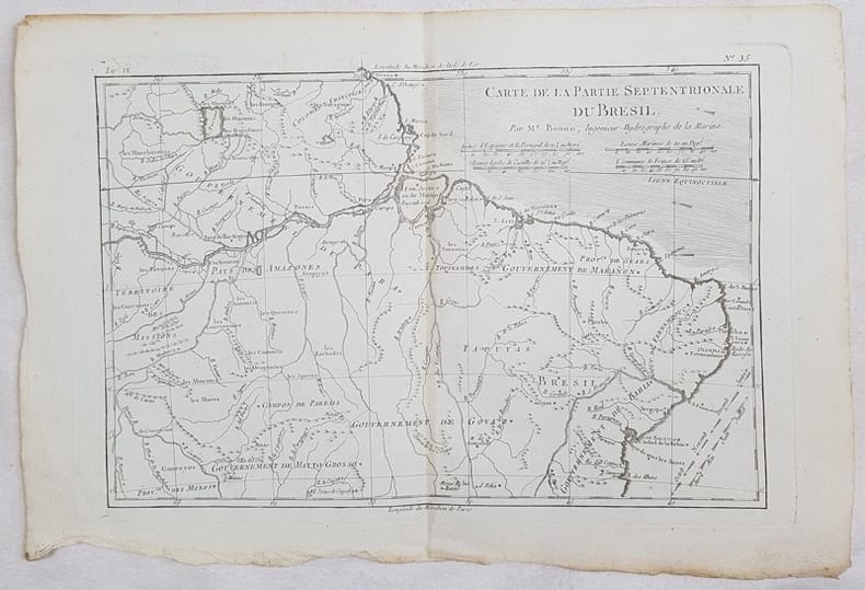 Mappa di Rigobert Bonne che mostra la costa settentrionale del Brasile. A nord ovest è indicato il leggendario Lago Parime. Molti esploratori credevano che sulle sue coste si potesse trovare la città di Manoa o El Dorado. Antica nota manoscritta al verso Autore: Rigobert Bonne (1727-1755), Andre Data: 1780 circa Tecnica: incisione su rame Dimensioni della pagina: 40,5x27 cm Dimensioni dell'incisione: 35x23 cm Condizioni: Buone. Piegatura verticale. Map by Rigobert Bonne featuring the Northern coast of Brazil. Of note is the legendary Lake Parime in the northwest. It was on the shores of this lake that many explorers believed they could find the city of Manoa or El Dorado. Ancient handwritten note in the back Author: Rigobert Bonne (1727-1755), André Date: 1780 circa Technique: copper engraving Leaf Dimension: 40,5x27 cm (15.9x10.6 inches) Engraving Dimension: 35x23 cm (13.8x9.1 inches) Conditions: Good conditions. Horizontal folding.