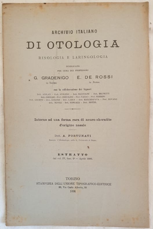 Edizione del 1896 di questa interessante pubblicazione di oculistica di Alfredo Fortunati. La pubblicazione analizza una rara forma di neuro cheratite d'origine nasale. Estratto dal Vol. IV, fasc. 2 Aprile 1896. In buone condizioni. Copertina editoriale in buone condizioni generali con lievi usure ai margini e dorso. Legatura in ottime condizioni. Pagine in buone condizioni con fioriture. Piegatura verticale. In 8. Dim. 24x15,5 cm. Pp. da 169 a 181. Edition of 1896 of this interesting pamphlet of oculistics by Alfredo Fortunati. The pamphlet analyzes a scarce form of neuro cheratitis of the nose. Extract from Vol. IV, fasc. 2 Aprile 1896. In good conditions. Editorial cover in good general conditions lightly worn in the extremities. Binding in very good conditions Inside pages are in good conditions with foxings. Vertical folding. In 8. Dim. 24x15,5 cm. Pp. from 169 to 181.