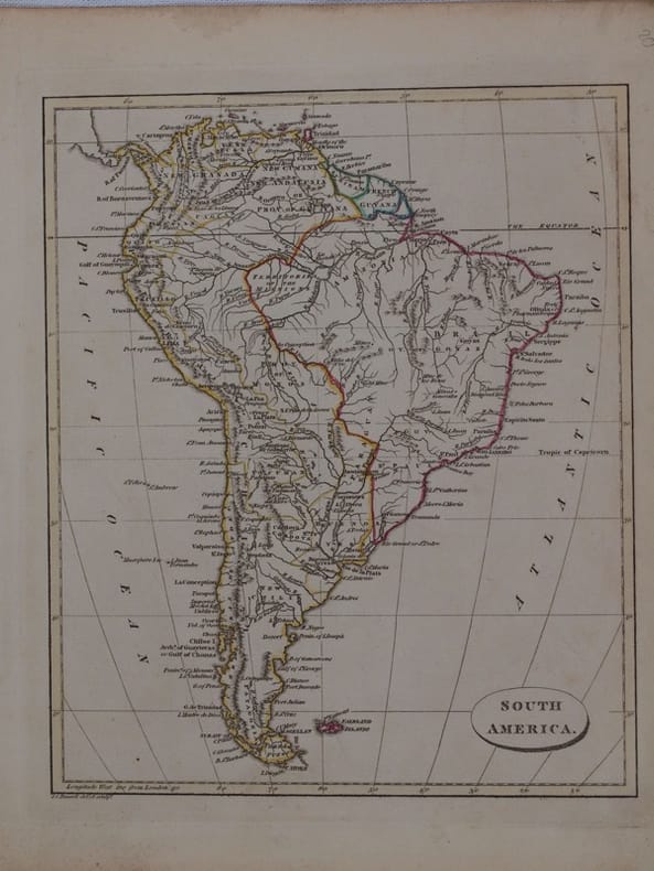 Mappa del Sud America del 1815 circa incisa e disegnata da J. C. Russell colorata a mano. Indicazione anche delle Isole Falkland Autore: J. C. Russell Atlas: Ostells New General Atlas Data: 1815 circa Tecnica: Acquaforte Dimensioni della pagina: 28x23,5 cm Dimensioni dell'incisione: 24x19,5 cm Condizioni: Buone. Usure marginali Nice map of South America of 1815 circa engraved and drawn by J. C. Russell coloured by hand with aquarello. Falkland Islands are also depicted. Date: 1815 circa Author: J. C. Russell Atlas: Ostells New General Atlas Technique: Copper etching Leaf Dimension: 28x23,5 cm (11x9.3 inches) Engraving Dimension: 24x19,5 cm (9.4x7.7 inches) Conditions: Good conditions. Some worn edges.