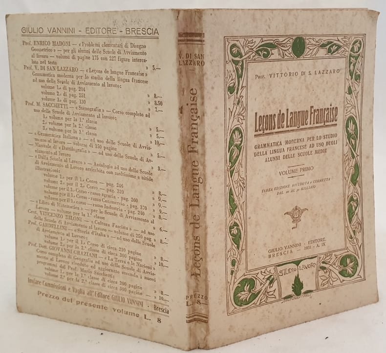 Edizione del 1931 di questa grammatica di lingua francese scritto da Vittorio di San Lazzaro. Volume primo ad uso degli studenti della scuola media. All'interno: regole generali di pronuncia ed elementi di grammatica, letture, dialoghi e poesie. Alla fine vocabolario. Bella copertina in stile liberty. In buone condizioni. Copertina editoriale in ottime condizioni generali con lievi usure ai margini e dorso. Legatura in buone condizioni. All'interno le pagine si presentano in ottime condizioni con rare fioriture. In 8. Dim. 20,5x14 cm. Pp. 215+(1). Edition of 1931 of this grammar of french language written by Vittorio di San Lazzaro. First volume for the usage of students of secondary school. Inside: generla rule of pronounciation and elements of grammar, readings, dialogues and poems. Vocabulary at the end. Beautiful cover in liberty style. In good conditions. Editorial cover in very good general conditions lightly worn in the extremities. Binding in good conditions. Pages in very good conditions with occasional foxing. In 8. Dim. 20,5x14 cm. Pp. 215+(1).