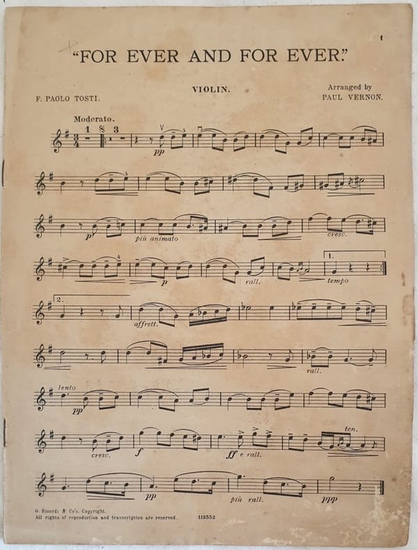 Raccolta di sei spartiti per violino arrangiati da Paul Vernon. All'interno: "For ever and for ever" di Francesco Paolo Tosti, "Barcarolle june" di Tschaikowsky, "the celebrated largo" di Handel, "Prayer from Tannhauser" di Richard Wagner, "Serenata" di Schubert, "Melody in f." di Rubinstein. Partitura per violino. In buone condizioni con fioriture. Fori all'angolo destro della prima pagina. Formato cm. 30,5x23. Pp. 7. Collection of six musical scores arranged by Paul Vernon. Inside: "For ever and for ever" by Francesco Paolo Tosti, "Barcarolle june" by Tschaikowsky, "the celebrated largo" by Handel, "Prayer from Tannhauser" by Richard Wagner, "Serenata" by Schubert, "Melody in f." di Rubinstein. Musical score for violin In good conditions with foxings. Hole in the right corner of the first page. Formato cm. 30,5x23. Pp. 7.