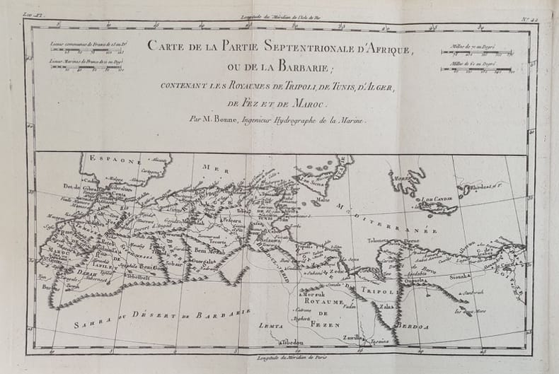 Mappa di Rigobert Bonne che rappresenta il Nord Africa (Tripoli, Tunisi, Algeria, Fez e Marocco). Autore: Rigobert Bonne (1727-1755), André Data: 1780 circa Tecnica: Incisione su rame Dimensione della pagina: 46x32 cm Dimensione dell'incisione: 35x23,5 cm Condizioni: Buone. Piegatura orizzontale. Very beautiful map by Rigobert Bonne featuring North Africa countries (modern-day Morocco, Algeria, Tunisia, Lybia). Author: Rigobert Bonne (1727-1755), André Date: 1780 circa Technique: etching on steel Leaf Dimension: 25,5x39,5 cm Engraving Dimension: 22,5x33,5 cm Conditions: Good conditions. Vertical foldings.