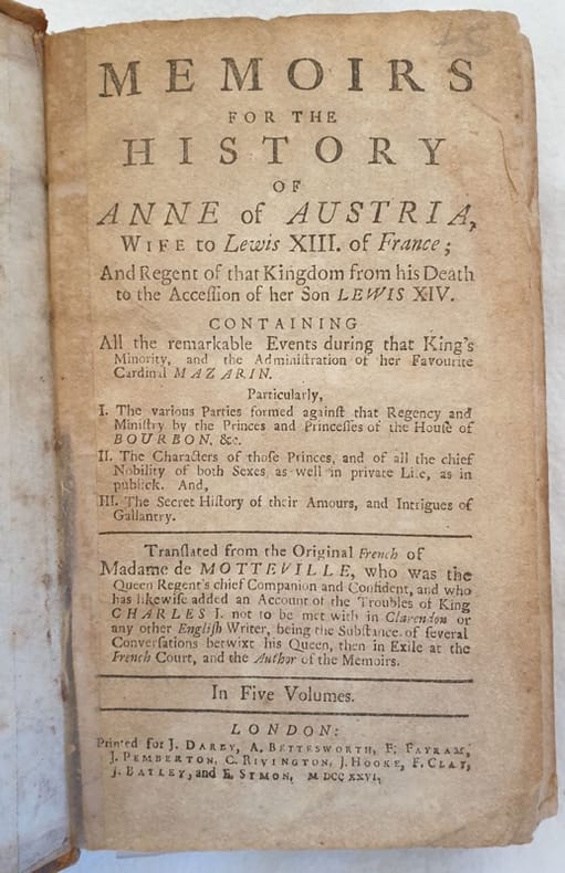 Edizione del 1726 di questa opera sulle memorie della Regina Anna d'Austria (1601-1666) principessa spagnola e arciduchessa austriaca della Casa degli Asburgo, Regina di Francia in quanto moglie di Luigi XIII. Opera scritta da Francoise de Motteville (1615-1689) prima Dama di Camera e confidente intima della Regina che ne raccoglie le memorie, il risultato è uno dei più importanti documenti storici su Anna D'Austria. L'opra era composta da cinque volumi, siamo purtroppo in possesso solo del primo. In discrete condizioni. Coperta in piena pelle con decorazioni in oro al dorso e a secco ai piatti in discrete condizioni generali con usure ai margini e dorso. Piatti attaccati con nastro adesivo. Legatura in buone condizioni ma rottura alla prima pagina. All'interno le pagine si presentano in buone condizioni con fioriture. Frontespizio e ultima carta attaccate con nastro adesivo. In 16. Dim. 17x10,5 cm. Pp. XVI+428+(16) Edition of 1726 of this work about the memories of the Queen Anna d'Austria (1601-1666) spanish princess and Austrian Archiduchessofthe House of Hasburg, Queen of France because wife of Louis XIII.<BR><BR>Work written by Francoise de Motteville (1615-1689) first chamber lady and intimate friend of the Queen who colleects the memories, the result is one of the most important hystorical documents about Anne of Austria. the work was made up of five volumes, we only have the first tome only. In fair conditions Leather cover with gilted decorations in the spine and embossed decorations i the plates in fair general conditions lightly worn in the extremities. Plates attached with adhesive tape. Binding in good conditions but crack in the first hinge. Pages are in good conditions with foxing. Title page and last page attached with adhesive tape. In 16. Dim. 17x10,5 cm. Pp. XVI+428+(16)