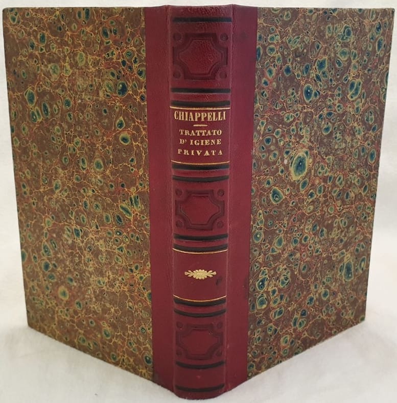 Edizione del 1856 di questo trattato di igiene privata scritto da Lorenzo Chiappelli. All'interno: gli alimenti loro conservazione e trasformazione (farina, lievito e preparazione del pane, legumi, alimenti animali, bagni (freddi, caldi, di stufa, russi e parziali), lozioni, epilazione, cosmetologia, capelli, denti, vestiti e loro effetti sul fisico, ginnastica, ballo, biliardo, igiene della voce, aria, igiene della gravidanza, allattamento ecc... In buone condizioni. Coperta in mezza pelle coeva con titolo e decorazioni in oro in ottime condizioni generali con lievi usure marginali. Legatura in buone condizioni. Pagine in buone condizioni con rare fioriture. In 8. Dim. 22,5x15 cm. Pp. 476. Peso Kg. 0,590. Edition of 1856 of this treaty of private hygiene by Lorenzo Chiappelli. Inside: food their preservation and transformation (wheat preparation of bread, animal food, baths (freddi, caldi, di stufa, russi e parziali), lotions, epilation, cosmetology, hair, teeth, dresses and their effects to the body, gymnastics, dance, biliardo, hygiene of voice, air, hygiene of delivery, milk breeding ecc... In good conditions. Half leather coeval cover with gilted title and decorations in the spine in very good general conditions lightly worn in the extremities. Binding in good conditions. Pages are in good conditions with foxing. In 8. Dim. 22,5x15 cm. Pp. 476. Peso Kg. 0,590