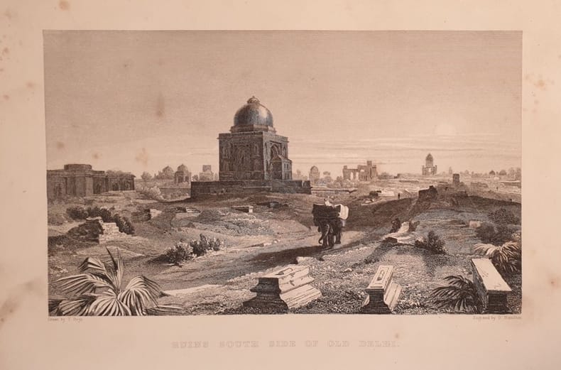 Planche del 1833 circa chee mostra alcune rovine nel lato sud della Vecchia Delhi. Autore: G. Hamilton after T. Boys Atlante: Fishers drawing room scrap book Data: 1833 circa Tecnica: incisione su rame Dimensione del foglio: 16x24 cm Dimensione incisione: 11,5x19 cm Condizioni: Buone. Alcune fioriture.Print of 1833 circa representing the ruins south side of Old Delhi. Author: G. Hamilton after T. Boys Atlas: Fishers drawing room scrap book Date: 1833 circa Technique: Copper etching Page Dimension: 16x24 cm (6.3x9.4 inches) Engraving Dimension: 11,5x19 cm (4.5x7.5 inches) Conditions: Good conditions. Occasional foxing. Missing part in the right edge.