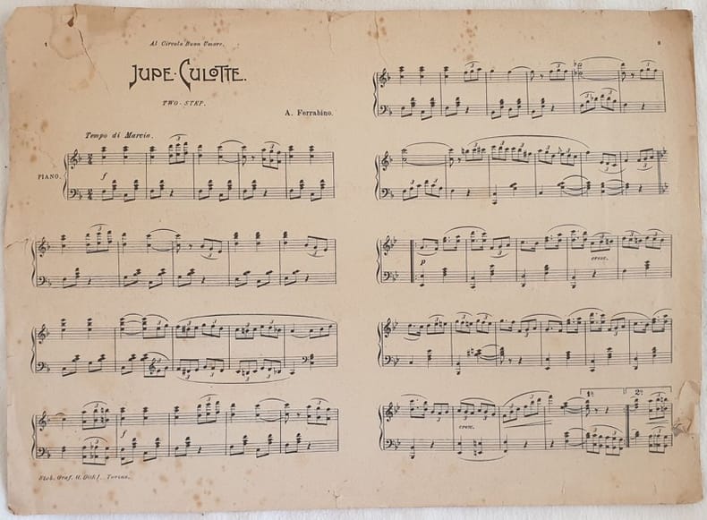 Partitura per pianoforte della melodia "Jupe Culotte" del compositore A. Ferrabino. Senza data ma degli anni '30 In discrete condizioni con fioriture e strappi marginali. Formato cm. 35x25,5. Pp. 4.Musical score for piano of the melody "Jupe Culotte" by the composer A. Ferrabino. No date but of 1930's circa The score is a page of magazine In fair conditions with foxing and tears in the extremities. Formato cm. 35x25,5. Pp. 4.