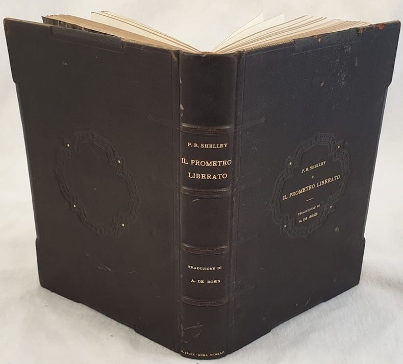 Bella edizione del 1922 del capolavoro di Percy Bysshe Shelley (1792-1822) nella prima traduzione italiana di Adolfo de Bosis (1863-1924) estetizzante dannunziano, amico di Pascoli e Sartorio fondatore de "il Convito". Le prime versioni italiane risalgono alla seconda meta' dell'800 (Mancini, Rapisardi, Di Lustro), ma la presente annulla tutte le precedenti. De Bosis viene unanimemente considerato il maggior cultore e traduttore italiano di Shelley. Esemplare n. 31 di cento esemplari numerati. Carta pregiata filigranata In ottime condizioni. Copertina in piena pelle nera con titolo e decorazioni in oro al dorso e decorazioni a secco e a rilievo in ottime condizioni generali. Legatura in ottime condizioni. Pagine in ottime condizioni con fioriture. In 8. Dim. 25x18 cm. Pp. 295+(1).Beautiful edition of 1922 of the masterpiece of Percy Bysshe Shelley (1792-1822) in the first italian translation by Adolo de Bosis (1863-1924) friend of Pascoli and Sartorio creator of "il Convito".<BR><BR>The first italian versions are of the second half of 19th century (Mancini, Rapisardi, Di Lustro), buit this is the considered the most faithful ans importrant translation. De Bosis is considered the most important translator and scholar of Shelley. Copy n. 31 of 100 numbered copies. Precious philigree paper In very good conditions Black leather coeval cover with gilted title and decorations in the spine and plates in very good general conditions lightly worn in the extremities. Binding in very good conditions. Pages are in very good conditions with foxing. In 8. Dim. 25x18 cm. Pp. 295+(1).