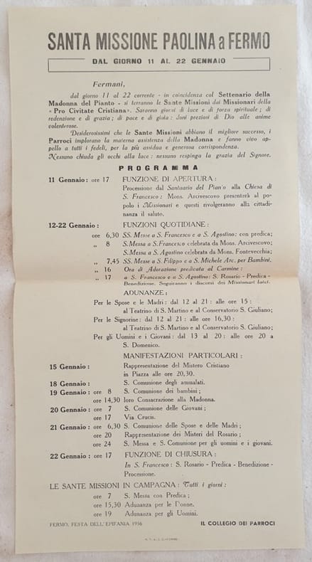 Manifesto pubblicitario del 1956 della Missione Paolina a Fermo in occasione della festa dell'Epifania.<BR>In buone condizioni con piegature. Formato cm. 33x17,5. Beautiful advertising poster of 1956 of Missione Paolina in Fermo in occasion of the Feast of Epyphany.<BR>In good conditions with foldings. Size cm. 33x17,5.