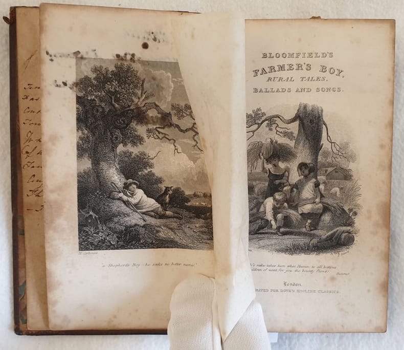 Edizione del 1830 circa di questa opera in versi, la sua più celebre, del poeta inglese laborista Robert Bloomfield (1766-1823). Antico manoscritto alla prima carta bianca, frotnespizio figurato e incisione in antiporta. Vita dell'autore all'inizio. In discrete condizioni Copertina in pelle coeva con titolo e decorazioni in oro in mediocri condizioni generali con usure e mancanze ai margini e dorso. Piatto posteriore staccato. Legatura in ottime condizioni. Pagine in buone condizioni con fioriture. In 24. Dim. 13x8 cm. Pp. 128+(16). Edition of 1830 circa of this work in verses, the most famous work of the english labouring-class poet Robert Bloomfield (1766-1823). Antique manuscript in the first blank page figurated title page and plate in the frontspice. Life of the author at the beginning. In fair conditions. Leather coeval cover with golden title and decorations in poor general conditions lightly worn in the extremities. Back plate is detached. Binding in very good conditions. Inside pages are in very good conditions with foxing. In 24. Dim. 13x8 cm. Pp. 128+(16).