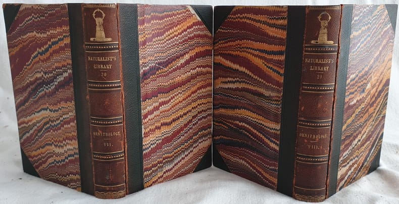 Interessante opera completa di ornitologia, in particolare sugli uccelli dell'Africa occidentale di William Jardine. L'opera in sè completa, fa parte della collana The naturalists library edited by Sir William Jardine (voll. XX e XXI). All'inizio lista di uccelli con nome latino e corrispettivo comune. Al primo tomo memoria di Bruce e gallinaacei, al secondo memoria di Le Vaillant e uccelli da caccia. Descrizione di ogni specie. L'autore Jardine è considerato un talentuoso artista di storia naturale. Alcune delle sue opere originali sono conservate al London Natural History Museum e al Royal Scottish Museum. Contribuì alla gran parte di questo testo. All'interno 64 incisioni fuori testo acquarellate coeve di William Home Lizars (1788-1859) su disegni di Swainson. Figlio dell'editore e incisore Daniel Lizars, studiò l'arte incisoria dal padre. Ritratto di Bruce e Le Vaillant in antiporta e frontespizio figurato a colori. Ex libris al contropiatto anteriore. In buone condizioni e completo. Copertina in mezza pelle coeva con titolo e decorazioni in oro al dorso in buone condizioni con lievi suure marginali. Rotture alle cerniere. Piatto anteriore in parte staccato. Legatura in ottime condizioni. Pagine in ottime condizioni con rare fioriture. In 8. 170 x 115 mm. Pp. 296, 263. Peso Kg. 0,800. Complete set of 1837 of birds of Western Africa with 64 coloured plates Contents: 296, 263. In 8 (6.7 x 4.5 in; 170 x 115 mm) Weight Kg. 0,800. 2 vols., Portrait of Bruce and Le Vaillant in the frontspice and coloured figurated title pages, 64 coloured plates of birds after drawings of the author itself, Half leather cover with golden title and decorations in the spine. Condition of contents: Very good conditions. Occasional foxings. Condition of binding: light damage to extremities. Crack in the Front plate of first tome. Solid binding These complete set of two volumes are the volumes n. XX and XXI of The naturalists library edited by Sir William Jardine . In the beginning list of birds with common and latin name. In the first tome Memoir of Bruce and gallinaceous birds, in the second tome memoir of Le Vaillant and game birds. Description of each bird. Jardine was considered a talented natural history artist. Some of his original work is in the London Natural History Museum and the Royal Scottish Museum. Jardine contributed much of the text to this work as well.