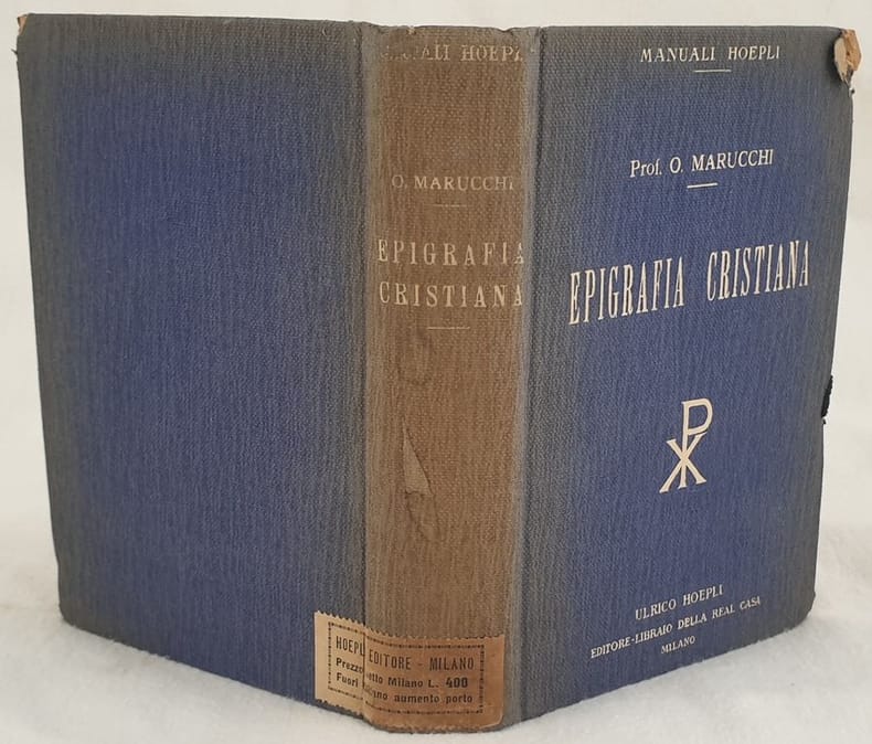 Interessante manuale Hoepli del 1910 di epigrafia cristiana scritto da Orazio Marucchi professore incaricato di Archeologia cristiana nella Regia Università di Roma. All'interno: Cenni generali di antica epigrafia romana, Cenni generali di epigrafia cristiana, Silloge di iscrizioni cristiane specialmente di Roma (iscrizioni primitive, dogmatiche, Cristo e Trinità, Eucarestia, Preghiere dei defunti, culto dei Santi, clero, Servi e liberti, cariche e professioni esercitate dai fedeli, nobili famiglie, iscrizioni consolari, fasti consolari, calendario, damasiane, Papa Siricio, Celestino, San Gregorio Magno, Catacombe romane ecc...) Alla fine 30 planches fotografiche. In buone condizioni. Copertina in tela editoriale in discrete condizioni generali con usure ai margini e dorso. Legatura in buone condizioni. Pagine in ottime condizioni con rare fioriture. In 16. cm 15,5x11,5. Pp. VIII+453+(30) Interesting Hoepli manual of 1910 of christian epigraphy written by Orazio Marucchi teacher of christian archeology in the University of Rome. Inside: roman epigraphy, christian epigraphy, Roman christian inscriptions (primitive inscriptions, dogmatics, Christe and trinity, Eucharisty, Prayers of dead people, Cult of Saints, Clergy, Servants, noble families, calendar, damasio, Papa Siricio, Celestino, San Gregorio Magno, Catacombe romane ecc...) At the end 30 photographic plates. In good conditions. Cloth editorial cover in fair conditions lightly worn in the extremities. Binding in good conditions. Pages in very good conditions with occasional foxing. In 16. cm 15,5x11,5. Pp. VIII+453+(30)