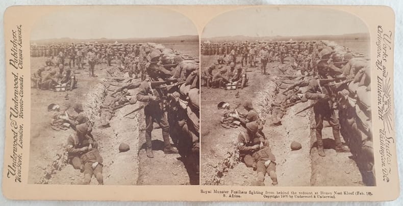 Rara veduta stereoscopica originale del 1900 che mostra una scena della Seconda Guerra Boera (1899-1902). Le immagini mostrano una trincea della battaglia del 16 febbraio a Honey Nest Kloof con alcuni soldati deceduti e feriti che vengono medicati e deceduti. Al verso didascalia in varie lingue (inglese, francese, tedesco, spagnolo, russo) e timbro del venditore autorizzato di Cape Town. Dimensione cm 9x8.Scarce original stereoscopic view of 1900 featuring a scene from second boer war (1899-1902). the images show a trench with some injured and dead soldiers. In the verso didascalia in different languages (english, french, german, spanish, russian) and stamp of the authorized seller from Cape Town. Size cm 9x8.