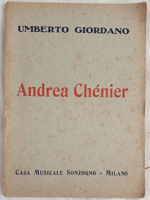 In 8. Dim. 19,5x13,5 cm. Pp. 72. Bel libretto d'opera degli anni '30 dell'opera lirica in quattro atti "Andrea Chenier" di Umberto Giordano (1867-1948) su libretto di Luigi Illica (1857-1919) ispirata alla vita del poeta francese Andrè Chenier (1762-1794). Senza data ma della fine del XIX secolo. La prima rappresentazione ebbe luogo al Teatro la Scala di Milano il 28 Marzo 1896 <BR>In buone condizioni. Bella brossura editoriale illustrata. Brossura editoriale in buone condizioni generali con lievi usure e strappi ai margini e dorso. Legatura in discrete condizioni. All'interno le pagine si presentano in buone condizioni con rare fioriture. Beautiful booklet of 1930's of the work in four acts "Andrea Chenier" by Umberto Giordano (1867-1948) on booklet by Luigi Illica (1857-1919) inspired to the real life of the french poet Andrè Chenier (1762-1794). <BR>The first representation took place in the Teatro La Scala in Milan the 28th of March 1896. <BR>Not dated but of the end of XIX century. In good conditions. Illustrated editorial cover. Editorial cover in good general conditions slightly worn in the edges and spine. Binding in fair conditions. Inside pages are in good conditions with occasional foxings.